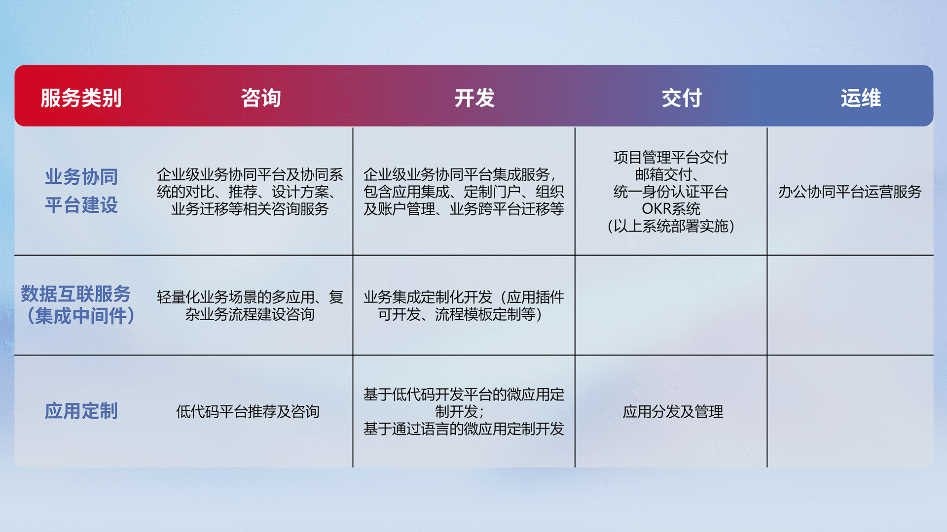 针对钉钉、、、、企微、、、、IDaas等平台级产品提供产品的规划、、、、方案、、、交付、、、、定制化开发等服务,,,实现如统一协同办公、、、、智能客户服务、、、、混合会议管理、、智能数据查询、、等业务场景,,实现数字化转型。。。。